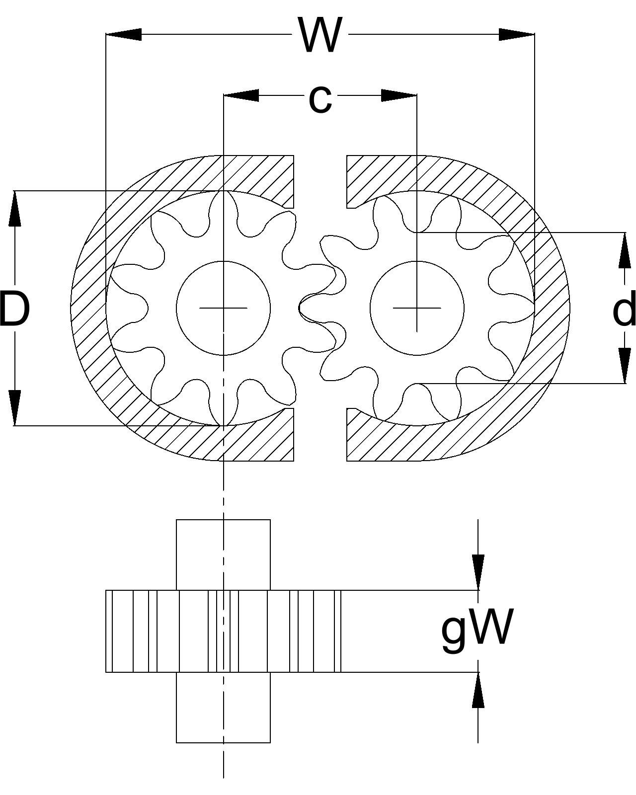 แท้จริงแล้วมีวิธีการวัด cc ของปั๊มง่ายๆ เพียงแค่วัดขนาดของ gear housing (สัญลักษณ์ D และ W) และ gear widht (สัญลักษณ์ gW) ตามภาพด้านล่าง