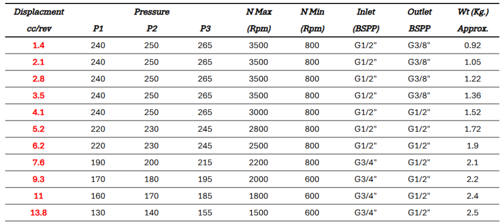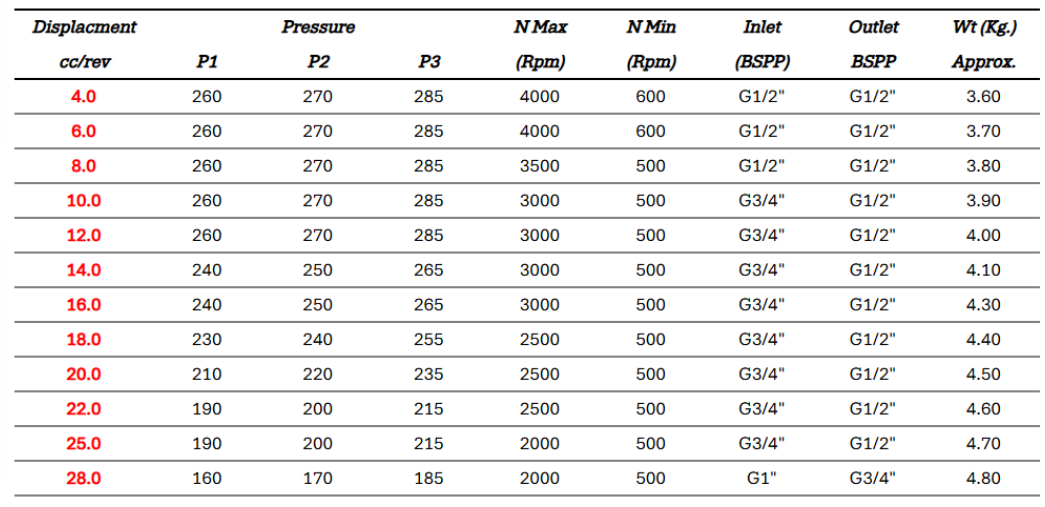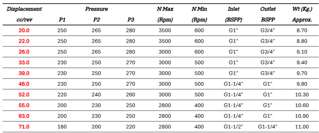 แต่ละกรุ๊ปจะแตกต่างกันที่ displacement ของปั๊ม (ซีซีต่อรอบ) และ แรงดันที่สามารถทนได้