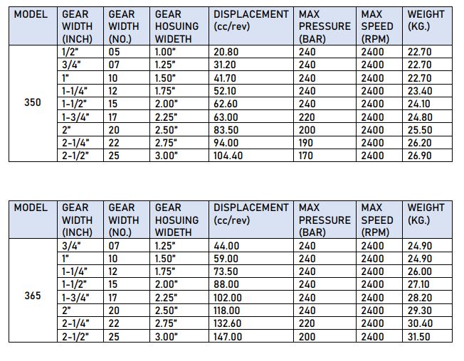 1. กำหนดรุ่น 350/365 และ displacement (cc/rev)